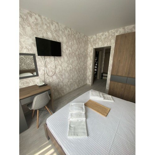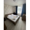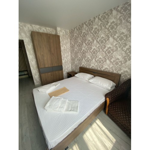 Двухкомнатные 4-5-ти местные номера (во всех корпуса): санузел в номере, телевизор (в каждой комнате во всех корпусах), холодильник, сплит-система (в корпусе 1-одна на две комнаты,в корпусе 2-в каждой комнате), двуспальные или односпальные кровати, возможен раскладной диван, шкаф, тумбочки, журнальный столик, зеркало,межкомнатная дверь (во 2 корпусе) или арка (в первом корпусе). Допместо предусмотрено в 1 и 2 корпусах. Балкон под запрос в одном номере над кафе-столовой.
