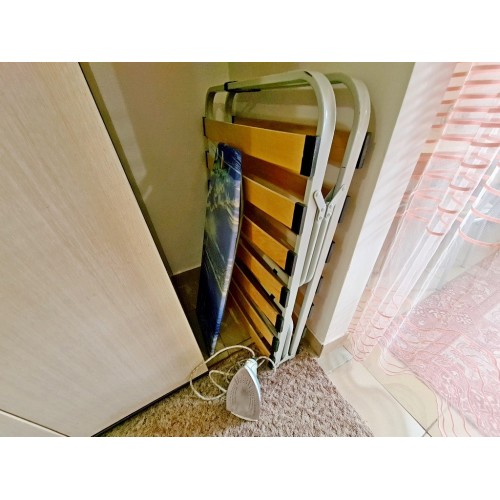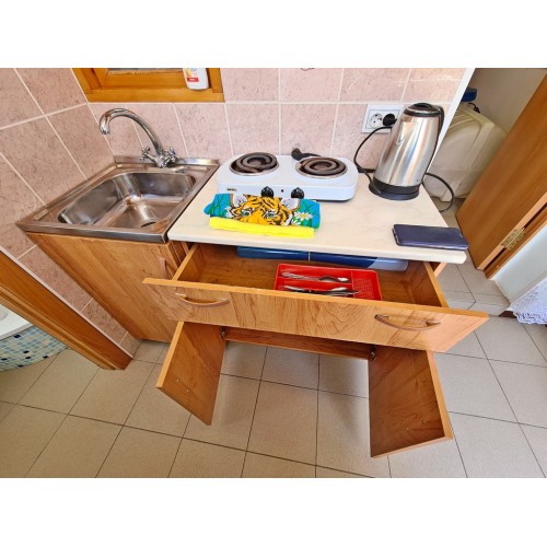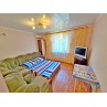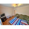 В первой комнате: двуспальная кровать, холодильник, вентилятор, гладильная доска, утюг. Во второй комнате: угловой диван, кресло, стол, шкаф, кондиционер, телевизор. На кухне необходимая мебель, электроплита, чайник, посуда. Совмещенный санузел: душевая кабина, раковина, зеркало, унитаз. Санузел по площади маленький. На балконе сушилка для белья.