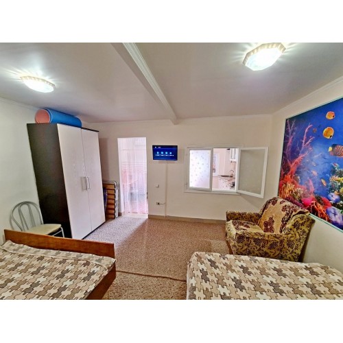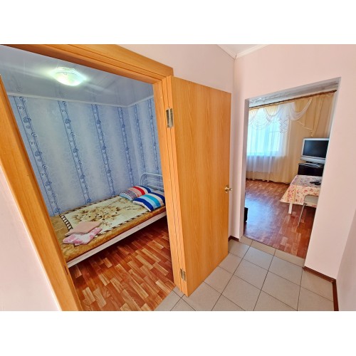 Водник № 22 (ФОТО 13-19): восьмая дорожка, 30 м от пляжа, 3-х и 4-х местные номера на первом этаже с дополнительным местом. Просторная комната, две односпальные и одна двуспальная кровати, кресло, тумбочка, шкаф, телевизор. Дополнительное место евро-раскладушка. На кухне необходимая мебель, кондиционер, холодильник, мультиварка, электроплита, микроволновка, чайник, посуда и водонагреватель. Совмещенный санузел: душевая кабина, раковина, зеркало, унитаз. Стиральная машина по запросу.