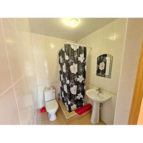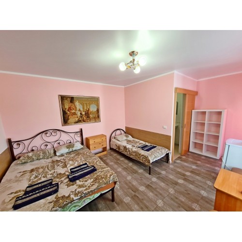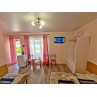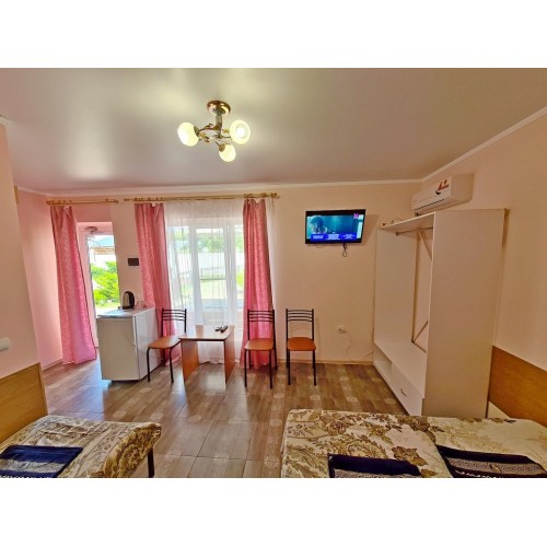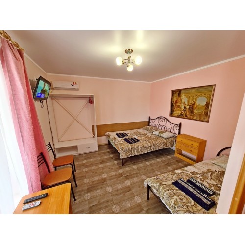 3-х местный номер со всеми удобствами на первом этаже (с допместом): просторная комната, односпальные и двуспальная кровати, необходимая мебель, сплит-система, телевизор, холодильник, чайник, набор посуды, санузел с душевой кабиной. У входа стол, стулья, сушилка для белья. Дополнительное место (кровать).