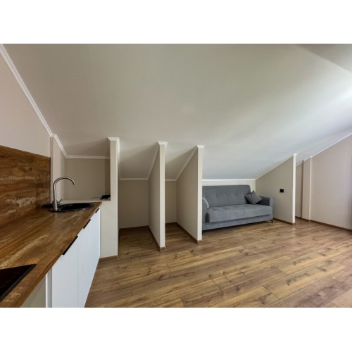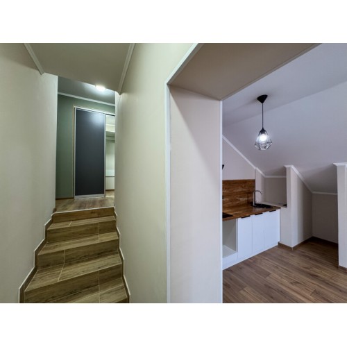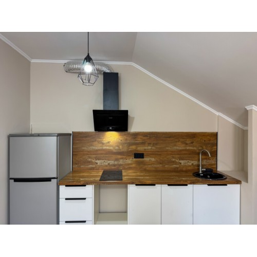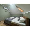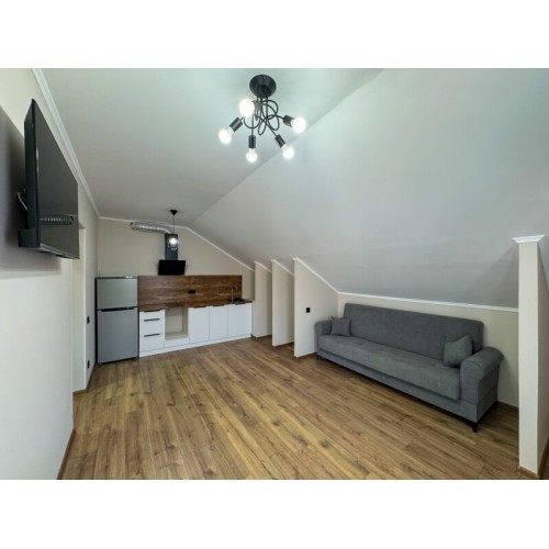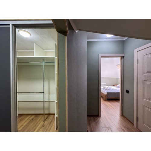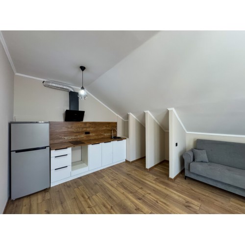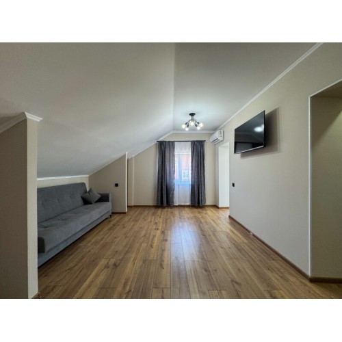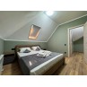 Двухуровневые апартаменты с кухней на 4 человека + возможны дополнительные места (мансардный этаж, 2 корпус), фото 75-88:  санузел в номере, телевизор, холодильник, сплит-система, двуспальная кровать, раскладной диван, шкаф, тумбочки, журнальный столик, зеркало, межкомнатная дверь или арка. Есть оборудованная всем необходимым кухня.