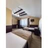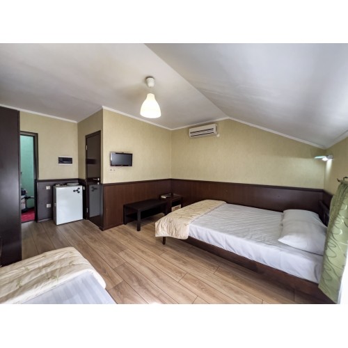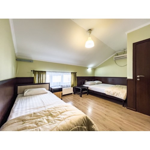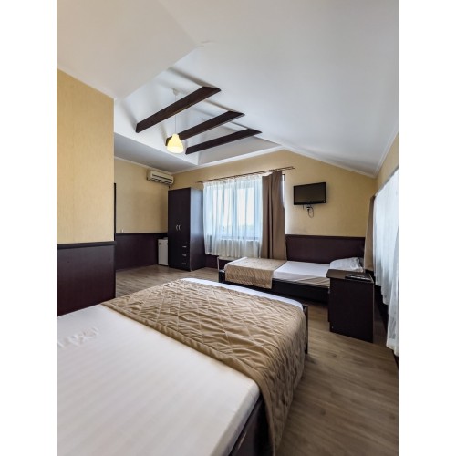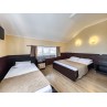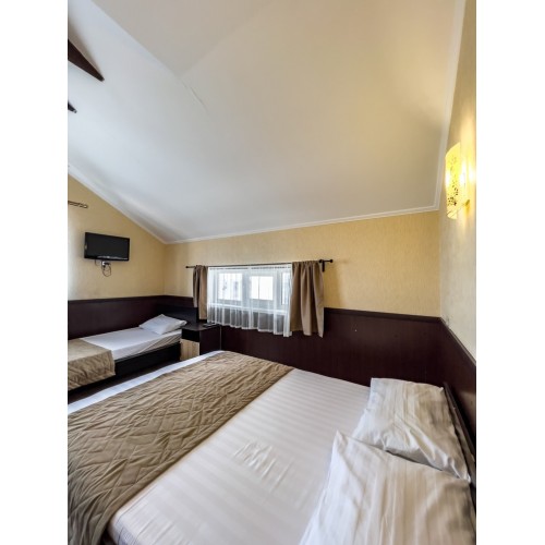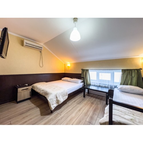 3-х местные номера (во всех корпусах): санузел в номере, в каждом номере телевизор, холодильник, сплит-система, двуспальная кровать и кресло-кровать, двуспальная кровать и односпальная кровать, шкаф, тумбочки, журнальный столик, зеркало. Дополнительное место не предусмотрено. Балкона нет!