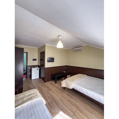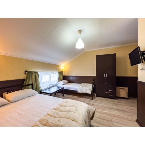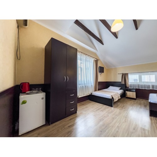 4-х местные номера (во всех корпусах, студия): санузел в номере, в каждом номере телевизор, холодильник, сплит-система, двуспальная кровать, односпальные кровати, кресло кровать или раскладной диван, шкаф, тумбочки, журнальный столик, зеркало. Дополнительное место под запрос. Балкон под запрос (только в одном номере над кафе-столовой).